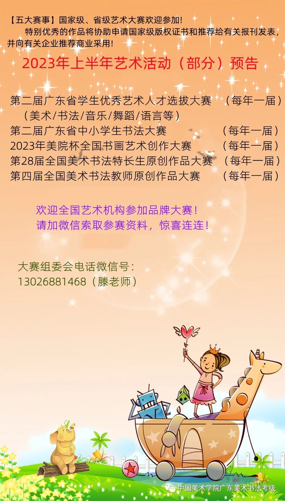 【五大赛事】国家级、省级艺术大赛欢迎参加,特别优秀的作品将协助申请国家级版权证书和推荐给有关报刊发表,并向有关企业推荐商业采用 2023年上半年艺术大赛(部分)预告 第二届广东省学生优秀艺术人才选拔大赛 (每年一届) (美术/书法/音乐/舞蹈/语言等) 第二届广东省中小学生书法大赛 (每年一届) 2023年美院杯全国书画艺术创作大赛 (每年一届) 第28届全国美术书法特长生原创作品大赛 (每年一届) 第四届全国美术书法教师原创作品大赛 (每年一届) 欢迎全国艺术机构参加品牌大赛! 请加微信索取参赛资料,惊喜连连! 大赛组委会电话微信号:13026881468(滕老师)